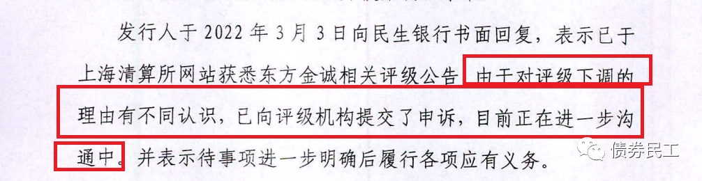2022年3月7日,江蘇中南建設集團股份有限公司(以下簡稱“中南建設”)披露《中國民生銀行股份有限公司關于東方金誠國際信用評估有限公司下調江蘇中南建設集團股份有限公司主體及相關債項信用等級觸發投保條款事項的公告》,明確提出“對于評級下調的理由有不同認識,已向評級機構提交了申訴”。也就是說,發行人對評級結果提出了異議。