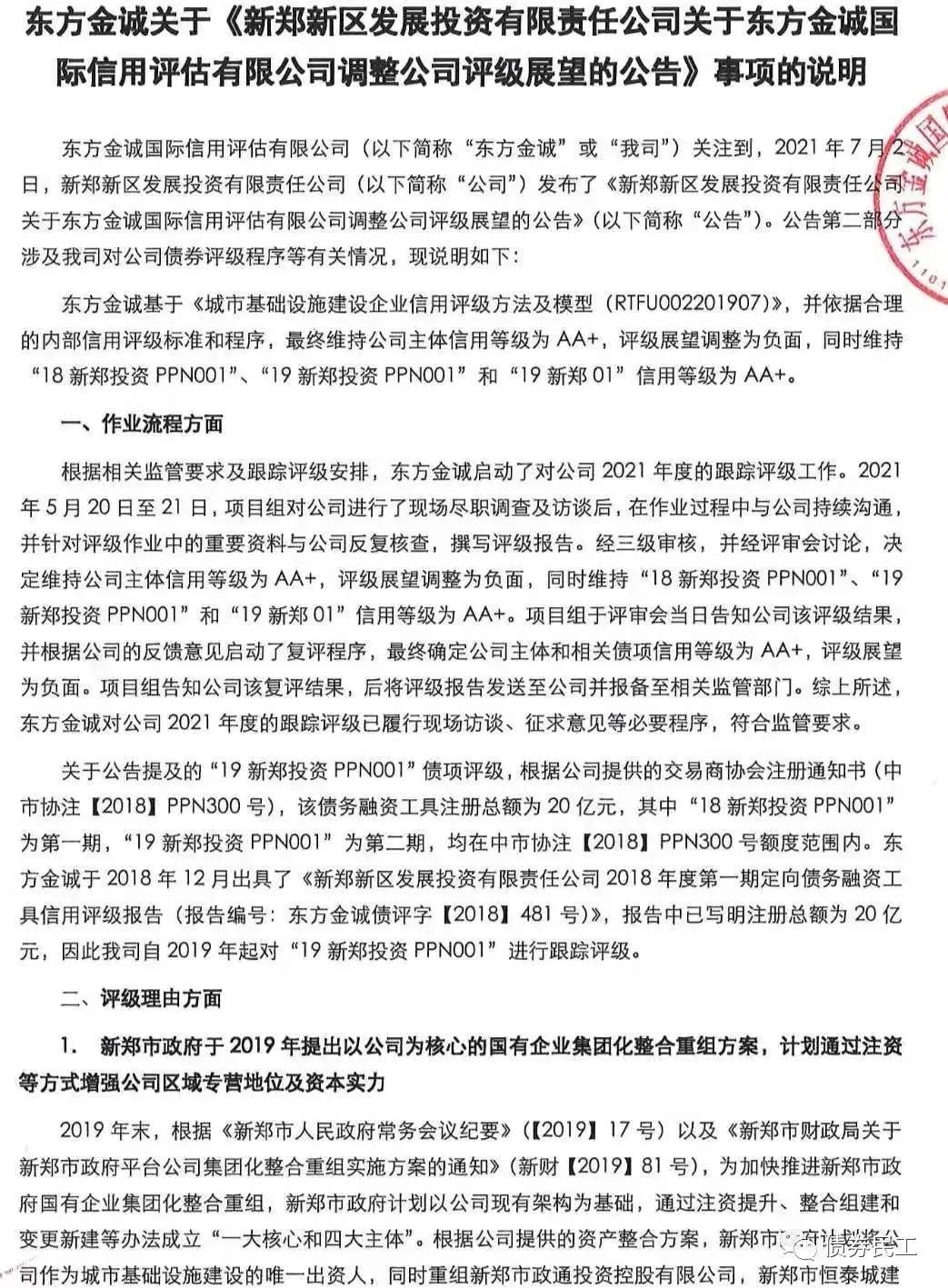 東方金誠于2021年7月6日出具了關于《新鄭新區發展投資有限責任公司關于東方金誠國際信用評估有限公司調整公司評級展望的公告》事項的說明,對新鄭投資的公告進行了回復:一是公司的作業流程已經履行了現場訪談和征求意見等必要程序,二是因為新鄭投資的集團化整合重組工作較為滯后,評級調整理由充分。