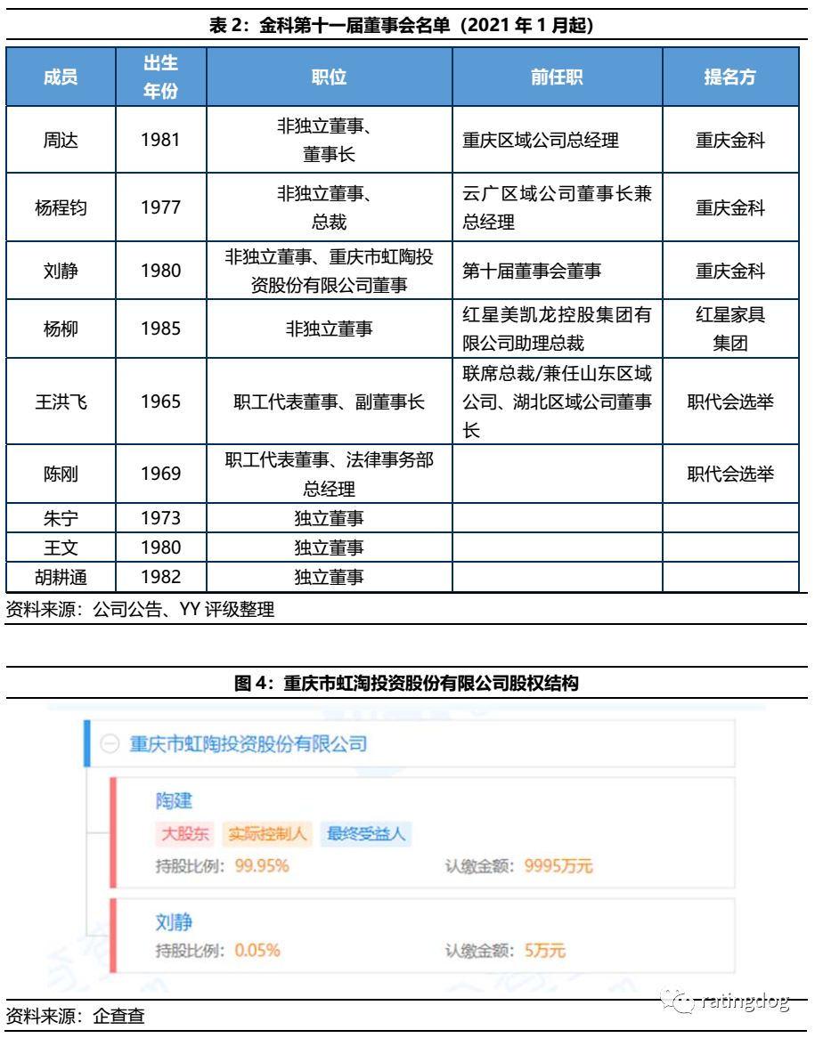 經營邊際來看,公司上半年銷售和回款正常,土儲充足,在19年擴張中加大城市下沉,導致目前尚存約四成土儲位于三線及以下城市。20年至21Q1,公司有意提升拿地城市能級,僅從2021Q1新獲土儲來看,公司保持了大本營重慶的優勢,但在其他城市的土儲質量則存在分化。財務方面,公司三道紅線指標在2020年末快速轉綠,即得益于債務受控和經營回款,也依靠物業子公司分拆上市、發行永續債和增加少數股東權益等手法。與此同時,公司表內融資結構惡化值得關注,而YY之前深度報告所述的表外債務風險也并未緩解。黃紅云與融創對金科地產集團股份有限公司(以下簡稱“金科”或“公司”)的“控制權之戰”打了近四年,中途黃紅云曾對媒體堅定表示“金科就是我的生命”,“個人不會放棄公司控制權”,他通過和前妻+女兒結為一致行動人、修改公司章程掌控董事會等操作,并留有至高可達9%股比的員工持股計劃作為后手,最終贏下了這場明爭暗斗。
