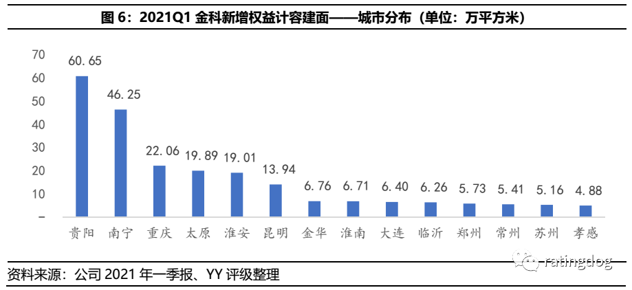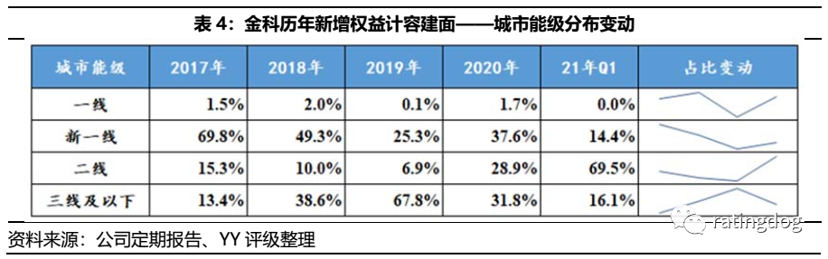 2021年1-6月,金科及所投資的公司實現銷售額約1,021億元,同比增長17.6%;銷售面積約1,005萬平方米,同比增長16.9%。按照2021年銷售目標計劃(不低于2,500億元),上半年完成全年目標的41%。下半年是發力推盤還是動態調整銷售目標仍需觀察。在合作開發成為行業趨勢的背景下,公司權益銷售比下滑到70%左右,仍保持較高水平。在公司推行的一年現金流回正的“高周轉”策略下,2020年回款率達到90%。21年一季度未披露銷售回款,但是對比銷售商品、提供勞務收到的現金和公司的權益銷售額,占比約71.9%,雖然低于2020年水平,但縱向來看波動不大。土地儲備方面,截至21年3月末,公司全口徑剩余可售建筑面積為7,145.48萬平方米,較2020年末基本持平,按2020年簽約銷售面積估算,可支撐未來3年銷售,土儲充足。但正如YY對金科的深度報告所述,公司在2019年擴張中選擇加大城市下沉,導致尚存較大比例土儲位于三線及以下城市。截至21年3月末,公司一二線土儲占比約59%(以二線為主),三線及以下城市土儲占比約41%。低能級城市購買力伴隨棚改紅利褪去,去化面臨一定壓力。邊際來看,2020年至今,公司有意提升拿地城市能級;新增土地儲備按權益計容建筑面積計算,2020年二線(含新一線)城市占比約66%,21年Q1比例提升至84%。區位布局上,公司2021Q1在重慶新增22萬平方米權益計容建面,在4月份的首批集中供地土地拍賣中也有所斬獲,在房企競爭中排名第6。其他主要的投拓項目位于貴陽經開區(離城區較遠)、南寧市的青秀區和綜合保稅區、太原市清徐縣和淮安市清江浦區等。僅從2021Q1新獲土儲來看,公司保持了大本營重慶的優勢,但在其他城市的土儲質量則存在分化,不應僅以城市能級作為評判標準。4.2 表內外債務風險