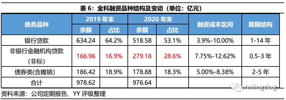 過去幾年金科有息債務快速增長,“三道紅線”政策出臺以來,公司有息債務規模得到控制,僅小幅增加。全部監管指標在一年內“神奇”達標,按公司披露,2020年末、2021年一季度末保持在綠檔。債務總額受控,公司表內融資結構惡化。2020年成本較高的非標貸款占比增長至28.6%,金額大幅增加112億元,與此同時銀行貸款減少116億元。