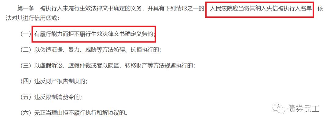 根據最高人民法院于2017年印發的《關于公布失信被執行人名單信息的若干規定》,有履行能力而拒不履行生效法律文書確定義務、以偽造證據、暴力、威脅等方法妨礙、抗拒執行的等六種情形需要納入失信被執行人名單。根據評級公告的信息,這個城投公司屬于第一種類型,即“有履行能力而拒不履行生效法律文書確定義務”。