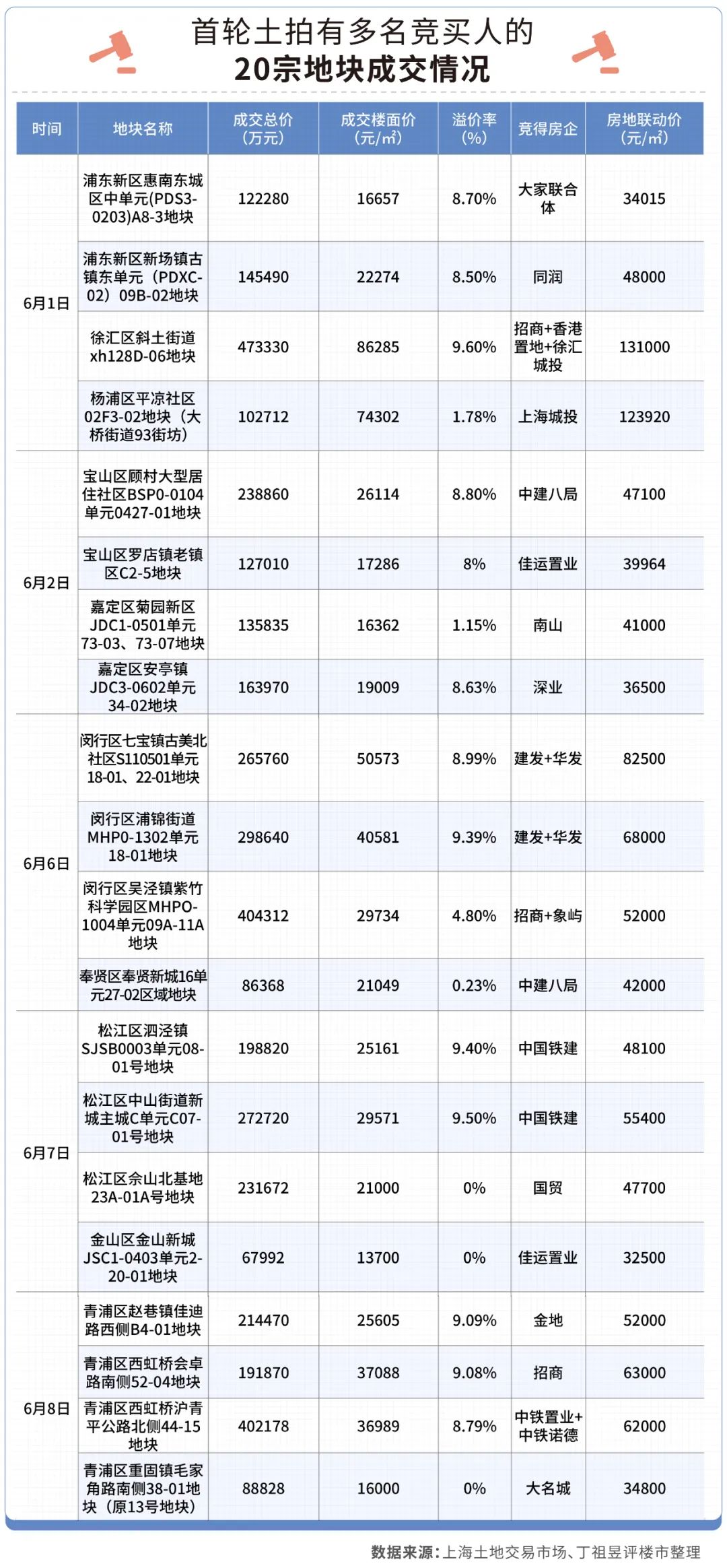 多人競拍的20宗地平均溢價僅6.2%,40宗地塊平均溢價率更低,只有3.3%。相較于去年首輪4.9%的平均溢價率,再降1.6個百分點,但比去年第三輪溢價率提升了0.8個百分點。