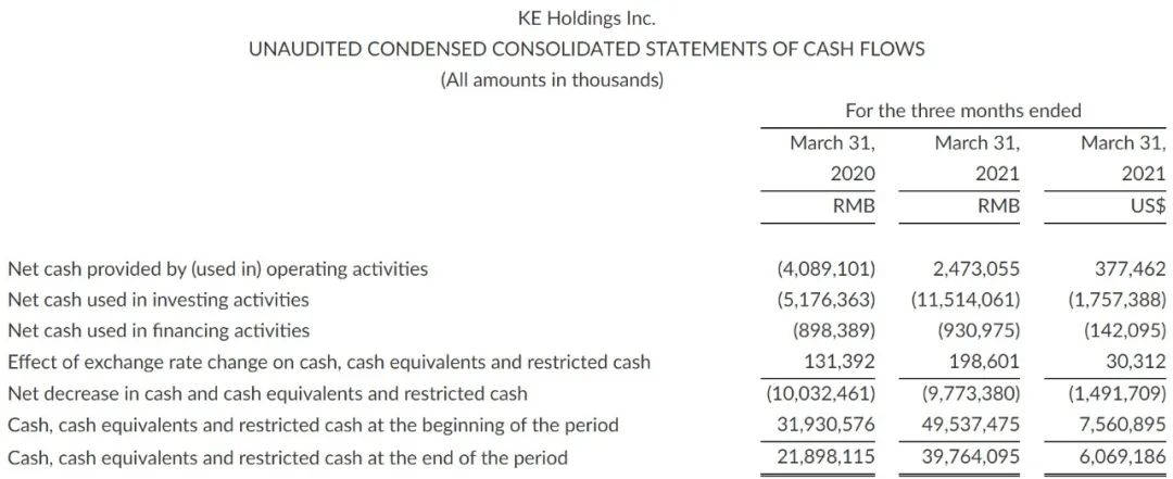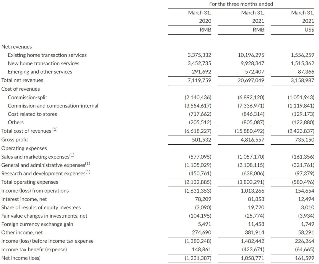 財報解釋說,2021年第一季度的高增長率,主要歸因于2020年第一季度較低的基數(shù),因為當時COVID-19爆發(fā),當然還有二手房和新房交易的發(fā)展支撐。