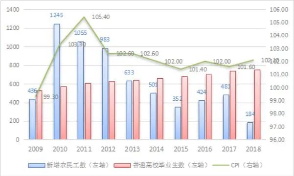 圖2.新增農(nóng)民工數(shù)、普通高校畢業(yè)生數(shù)及CPI(單位:萬人)