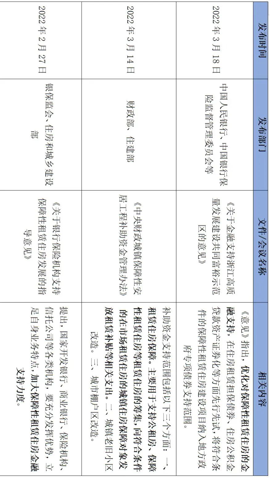 2022年第一季度,中央及各地方政府相繼發(fā)布發(fā)展保障性租賃住房的實施意見,明確保租房供應(yīng)目標(biāo),加強金融支持,完善金融服務(wù)體系,強調(diào)工程質(zhì)量重要性,加速推進保障性租賃住房的建設(shè)。