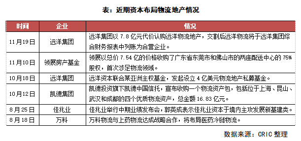 2021年11月19日遠洋集團以7.8億元代價認購遠洋物流地產(chǎn)所配發(fā)的3萬股目標股份,交割后遠洋物流將于遠洋集團綜合財務報表中列賬為合營企業(yè)。而不久前,10月凱德中國信托先以16.834億的價格收購了上海、昆山、武漢和成都的四個優(yōu)質物流資產(chǎn)。后11月,領展又以7.54億的價格收購了位于廣東省東莞市和佛山市的兩座配送中心的75%股權,實現(xiàn)了首次涉足物流領域。