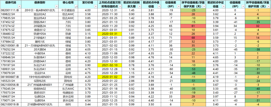 粗略認(rèn)為一級市場博弈后的發(fā)行價格即為當(dāng)時的真實市場價格,估值和真實市場價格之間的偏差再乘以前述基準(zhǔn)日的剩余久期就是價格上的估值偏差。價格上的估值偏差除以票息則是抹平估值偏差(負(fù)偏離)的天數(shù)或浮盈(正偏離)對應(yīng)的保護(hù)天數(shù)。