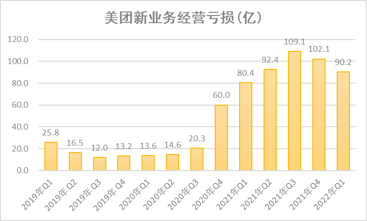 而美團為此付出的代價則顯而易見。2021年,該三項業(yè)務便給美團帶來了高達384億元的虧損。受此拖累,新業(yè)務虧損一路走高,至2021年Q3和2021年Q4,美團新業(yè)務虧損金額則分別達到驚人的109億元和102億元。