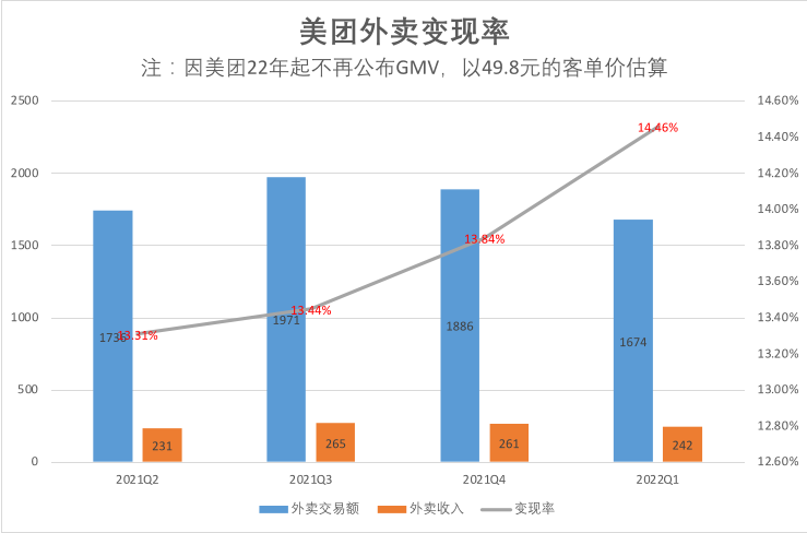 如果按照美團2021年平均約49元的客單價計算,2022年第一季度的變現(xiàn)率約為14.67%;即使以券商推算的較高值49.8元進行計算,變現(xiàn)率仍然達到14.46%,依然是歷史新高。