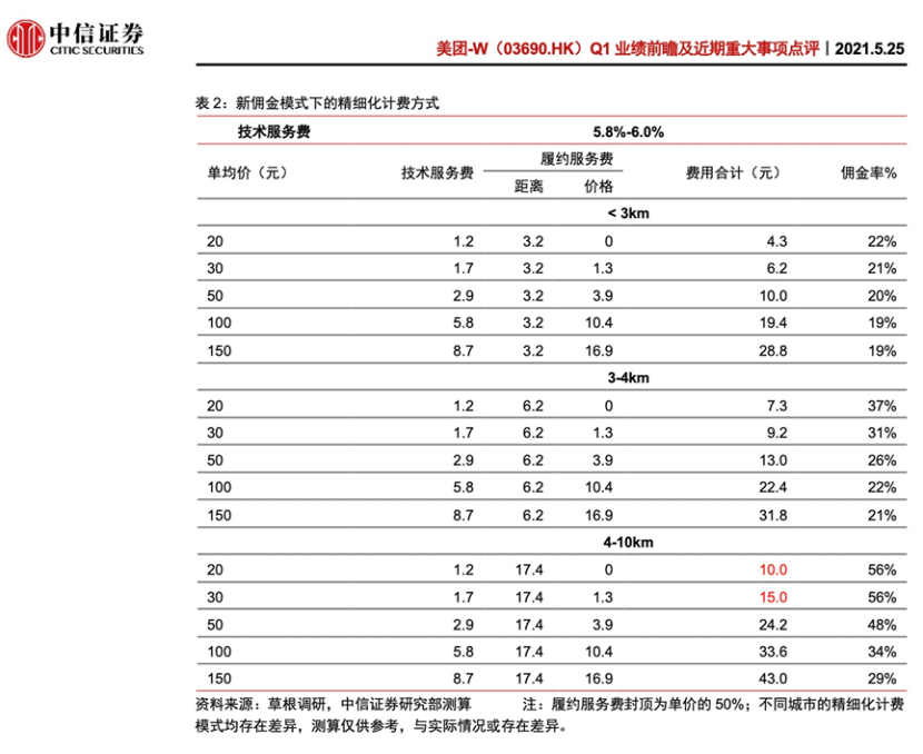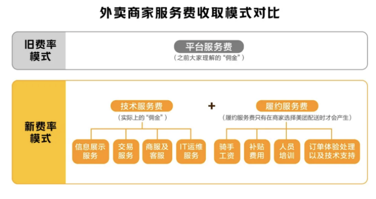 2021年初,為緩解監(jiān)管壓力和商家爭議,美團開始了傭金“透明化改革”,將原先按比例收取的傭金,拆分成技術服務費和履約服務費兩部分,并通過時間分段計費和距離分段計費的方式對履約服務費進行約定。