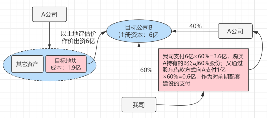 2.【土地作價入股】:A公司單獨成立項目公司。該地政府對于土地作價入股,不視同土地使用權轉讓,不受25%投資額的要求。目標地塊評估價6億元(原始成本1.9億),全部進注冊資本金。由于A公司后期表示想留有部分股權享受開發收益,因此在土地作價入股完成后,我司收購60%股權。