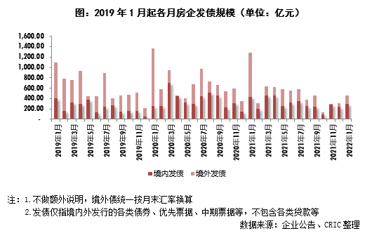 本月4日,央行在2022年貨幣信貸工作會議上表示要繼續穩妥實施房地產金融審慎管理,同時也要健全市場化利率形成和傳導機制,繼續深化LPR改革。6日發改委也發文提出要配合做好金融安全、房地產調控等工作。整體看來,本月政府對房企融資繼續落實“房住不炒”的原則,堅持進行審慎管理。不過由于本月6日銀行告知大型房企針對出險房企的承債式收購舉借的并購貸款不計入“三條紅線”,再加上央行營業管理部在24日表明會支持房企合理融資需求,加大住房租賃金融支持,未來房企的融資環境可能會得到一定的放松。