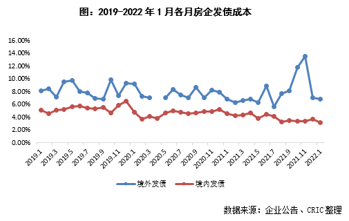 本月100家典型房企的融資總量為929.46億元,環比上升26%,同比下降56%。其中發債總額457.20億元,環比上升44.7%,同比下降64.3%。本月房企融資成本4.53%,較2021年全年下降0.76pct,其中境外債券融資成本達6.85%,下降0.19pct,境內債券融資成本3.20%,下降0.87 pct。境內發債的企業中,白名單企業繼續發揮融資優勢,繼續發行利率較低的債券;境外發債成本方面,旭輝、遠洋等發行了綠色擔保票據,其成本不超過5%,也相對較低,還有部分企業完成了境外債的交換要約和額外發行,成本相對較高。