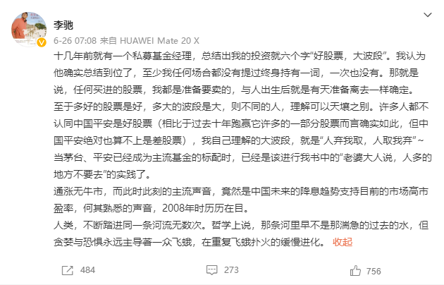 “任何買進的股票,我都是準備要賣的,與人出生后就是有天準備離去一樣確定。”6月26日,堅定持有中國平安十余年的私募大佬李馳在微博中撰文寫道。