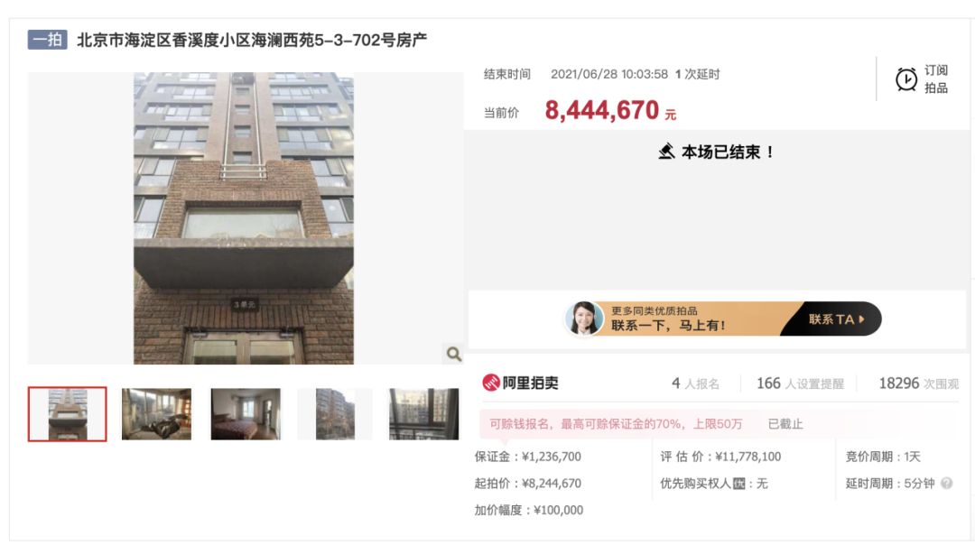 比如這兩天剛結(jié)束的一套北京市海淀區(qū)香溪度小區(qū)的房產(chǎn),涉案房產(chǎn)系沒收上繳國庫財產(chǎn)。起拍價為824萬元,市場價1320萬元,保證金為123.67萬元,4人報名,18029人圍觀,3次出價,最終以高于起拍價20萬元,總價844萬元成交,低于市場價近500萬。