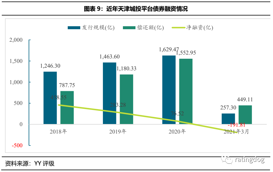 總體來看,天津區域經濟縮水,金融資源乏力,債券凈融資逐年下滑,整體融資壓力大。