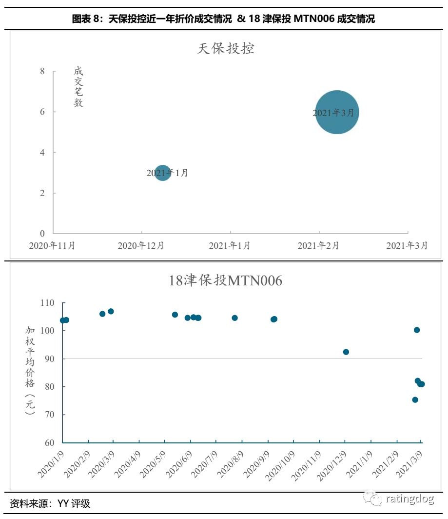 從成交情況來看,津城建折價成交始于20年12月,至21年3月,折價成交開始增多,或受區域負面輿情影響所致。20津投10成交價20年4月以來維持在90以上,20年12月出現零星折價成交,21年2月底價格走低重現折價成交。