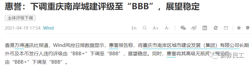 2021年4月29日,境外評級機構惠譽同時下調了重慶國際物流樞紐園區建設有限責任公司和重慶市南岸區城市建設發展(集團)有限公司的評級級別,由BBB下調至BBB-。