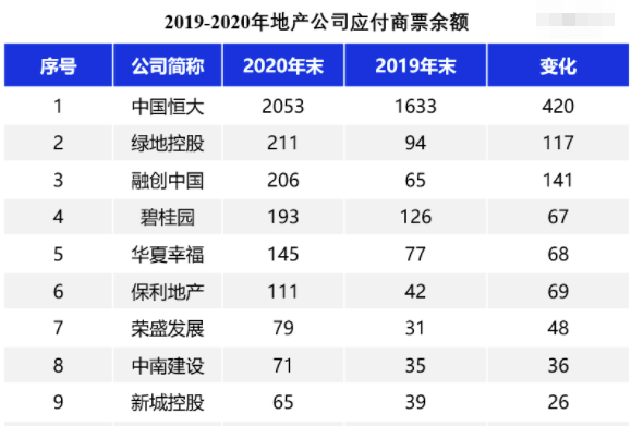 中國恒大、華夏幸福、綠地控股、碧桂園、融創中國這些“踩線較多的房企不僅商票簽發量大,而且2020年均出現大幅增長;”