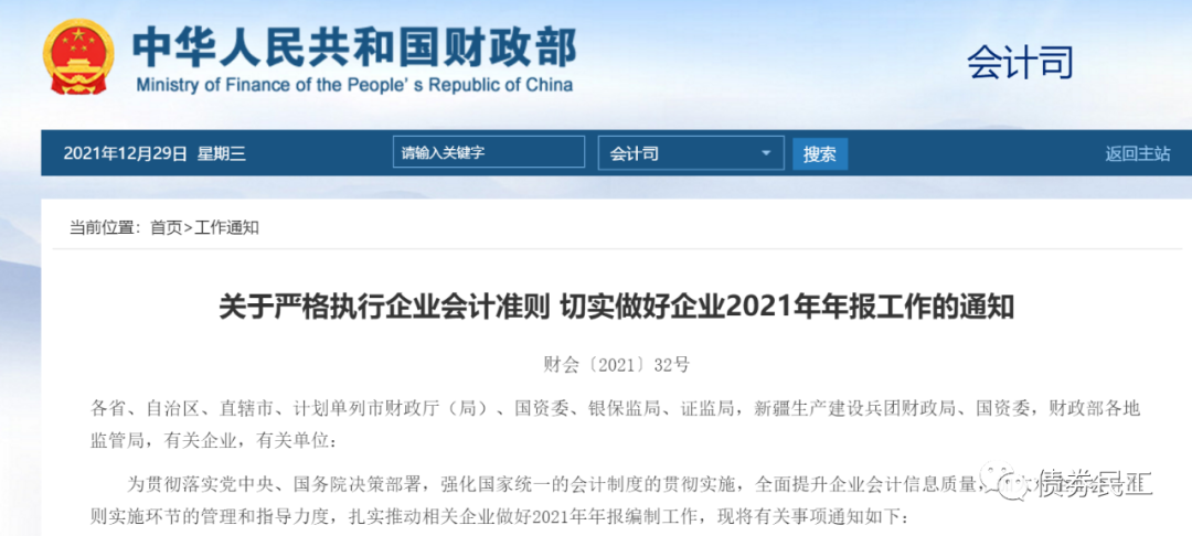 財(cái)政部于2021年12月29日披露了與國(guó)務(wù)院國(guó)資委、中國(guó)銀保監(jiān)會(huì)和證監(jiān)會(huì)四部委于聯(lián)合制定的《關(guān)于嚴(yán)格執(zhí)行企業(yè)會(huì)計(jì)準(zhǔn)則 切實(shí)做好企業(yè)2021年年報(bào)工作的通知》(財(cái)會(huì)[2021]32號(hào)),切實(shí)強(qiáng)調(diào)要做好2021年年報(bào)工作。