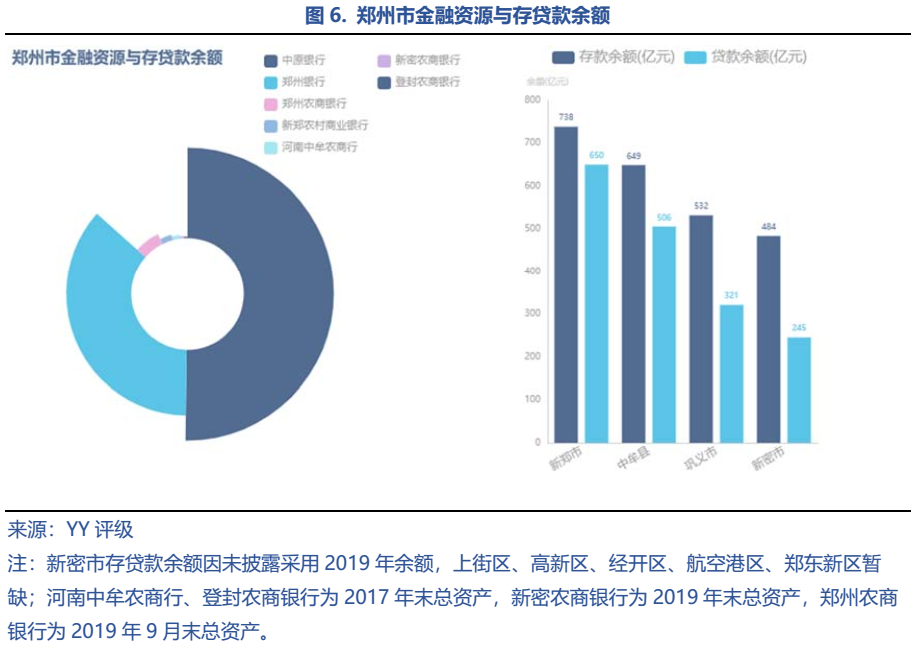 鄭州銀行數量尚可,但主要是農商行,信息披露程度不高。鄭州市共有9家銀行,其中2家城商行(中原銀行和鄭州銀行),7家農商行(鄭州農商銀行、中牟農商銀行、新密農商銀行、鞏義農商銀行、新鄭農村商業銀行、滎陽農商銀行和登封農商銀行)。從數量上看,鄭州市銀行并不少,但以農商行為主,財務信息披露不多,除中原銀行、鄭州銀行、新鄭農村商業銀行之外,其余銀行的總資產等數據僅可追溯至2017、甚至2011年。2020年末中原銀行和鄭州銀行的資產規模分別為7,574.82和5,478.13億元,在“中國銀行業100強榜單”中分別位居第35和42名,金融資源實力較強。