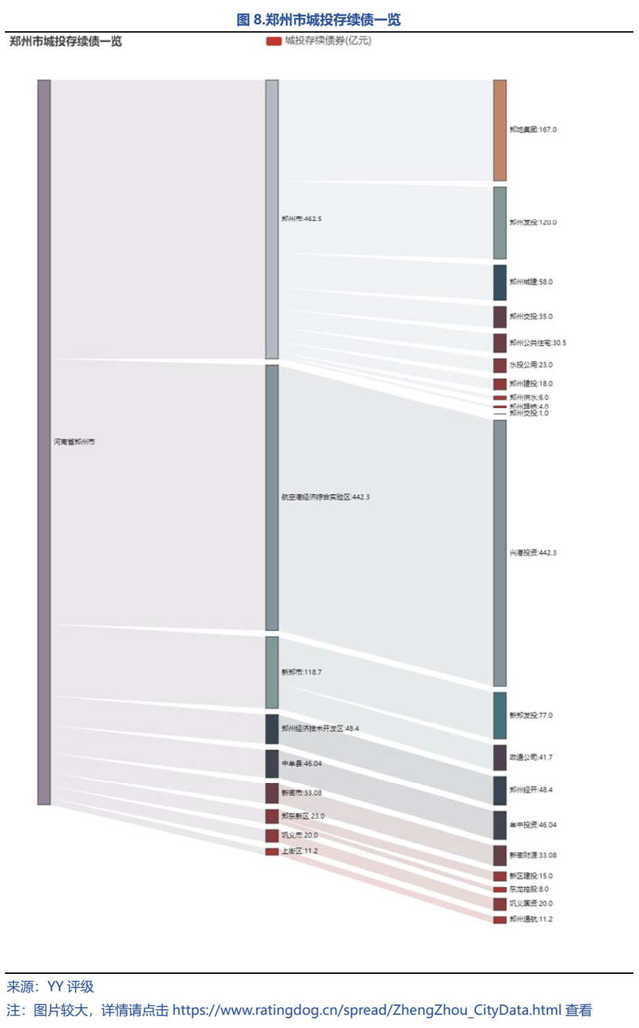 鄭州市總體債務率不高,分區域看,因發展需要,航空港區2018、2019年有息債務“一騎絕塵”,但2020年數據尚未披露完整。從目前可得的2020年的債務數據來看,中牟縣的帶息債務絕對值和債務率均最高,截至2020年末,中牟縣有息債務余額為222.32億元,YY-Ratio為364.46%,債務風險并不高;新鄭市的有息債務余額和債務率次之;值得注意的是,上街區的有息債務余額雖然不高,但因財政實力較弱,YY-Ratio較高。