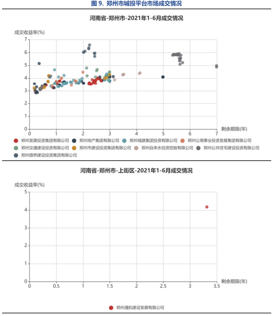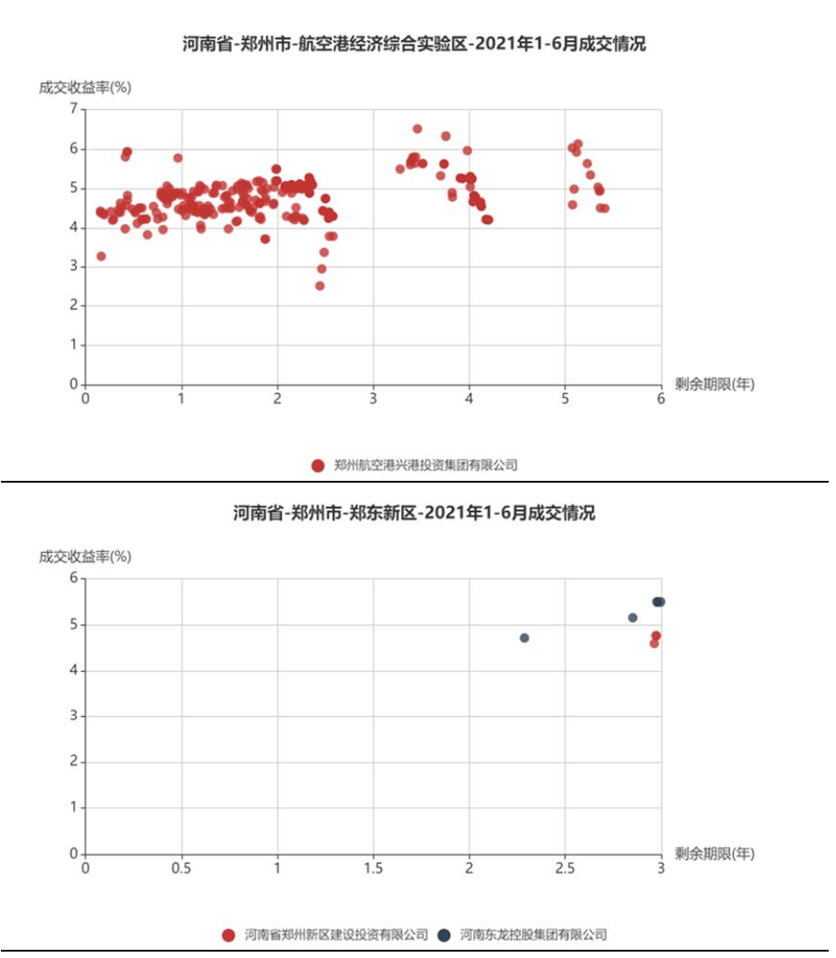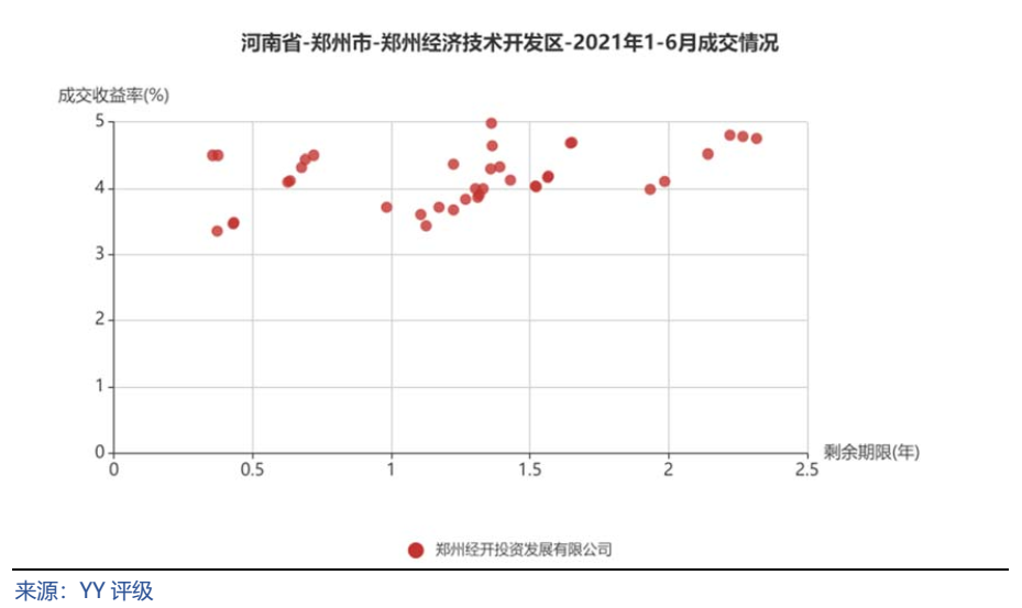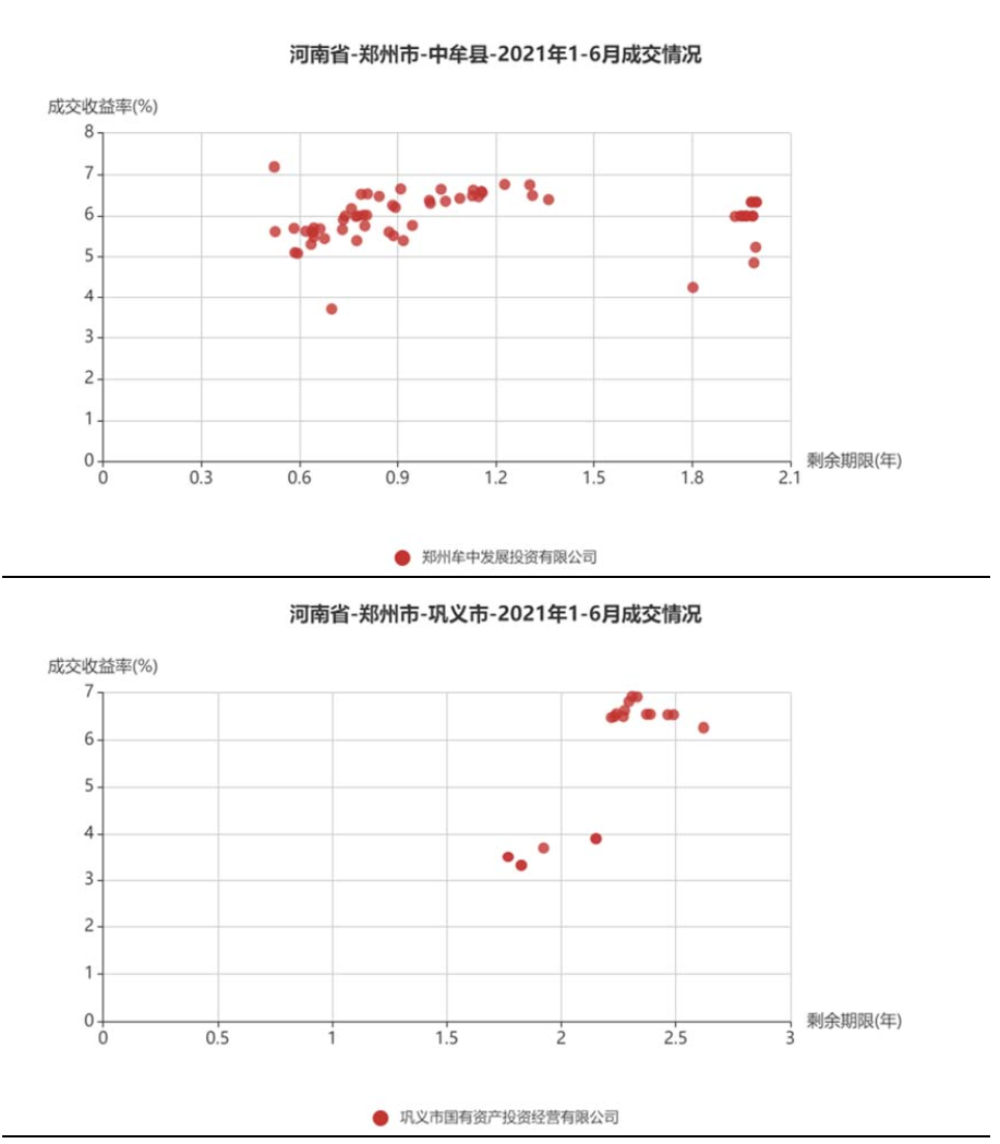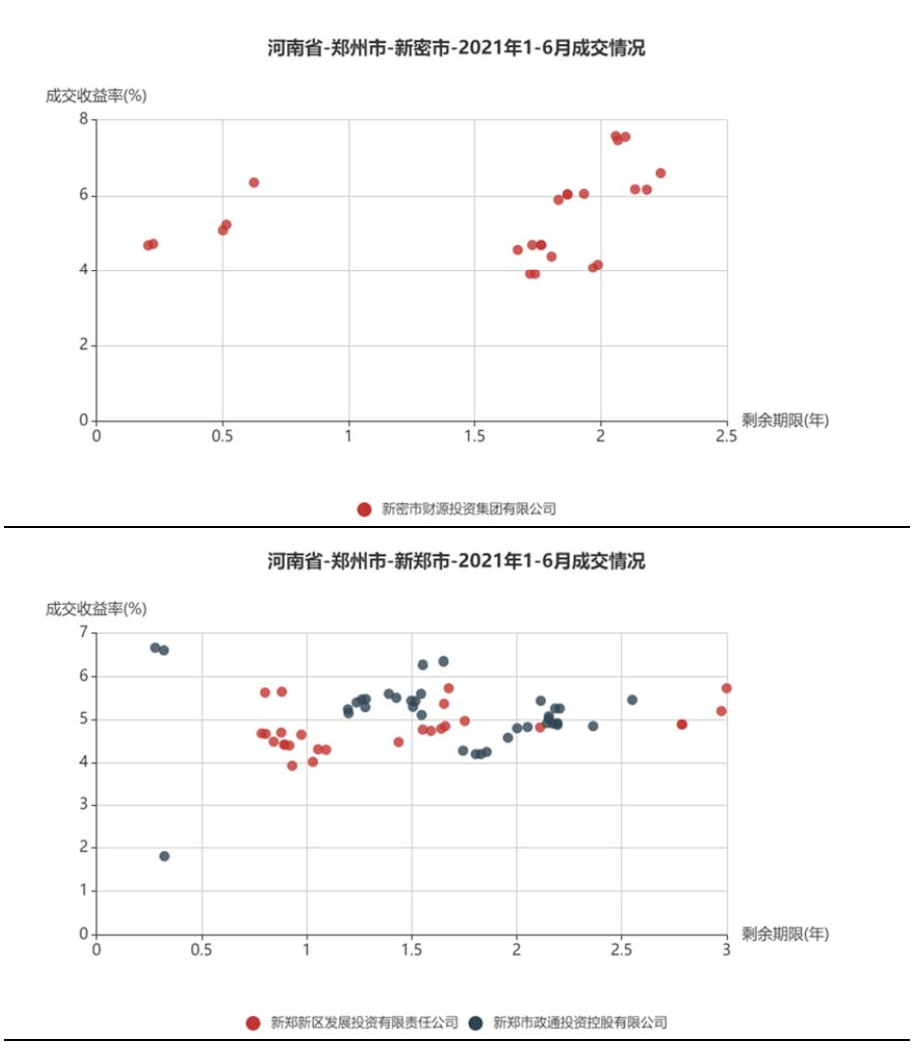 將鄭州市城投平臺按照行政層級和所屬區域,分為9類分別展示成交情況。具體來看,鄭州市級平臺成交活躍,成交收益率分散在3%~6%,基本隨著剩余期限遞增;中牟縣成交收益率相對較高,在5%~7%;鞏義市分散在3%~4%和6%~7%兩個區間;新鄭市、航空港區、鄭東新區均集中在4%~6%;經開區集中在4%附近;新密市成交收益率相對分散;上街區僅一個成交主體。