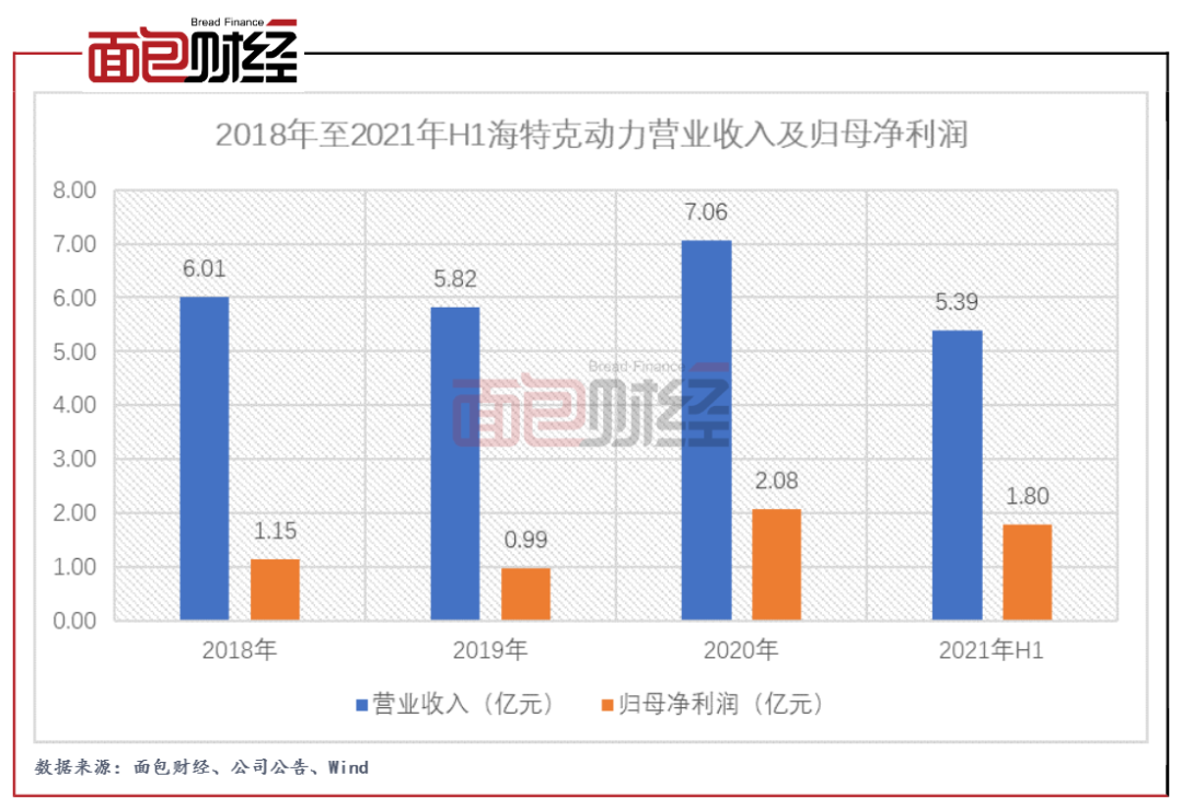 2019年和2020年,海特克動力實現(xiàn)營業(yè)收入分別為5.82億元、7.06億元,同比分別增長-3.14%、21.19%;實現(xiàn)歸母凈利潤分別為0.99億元、2.08億元,同比分別增長-13.84%、109.61%。2021上半年,公司實現(xiàn)營業(yè)收入5.39億元、歸母凈利潤1.8億元。