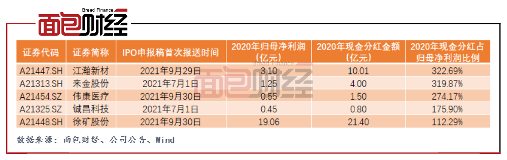 不僅僅是海特克動力,擬上市前的高比例分紅也成為不少企業(yè)的選擇。以2021年下半年報送IPO申報稿的企業(yè)為例,據(jù)不完全統(tǒng)計,有5家企業(yè)在2020年的現(xiàn)金分紅金額占該年度歸母凈利潤的比例達100%以上。其中江瀚新材在2020年現(xiàn)金分紅逾10億元,占該年度歸母凈利潤的比例達3倍。