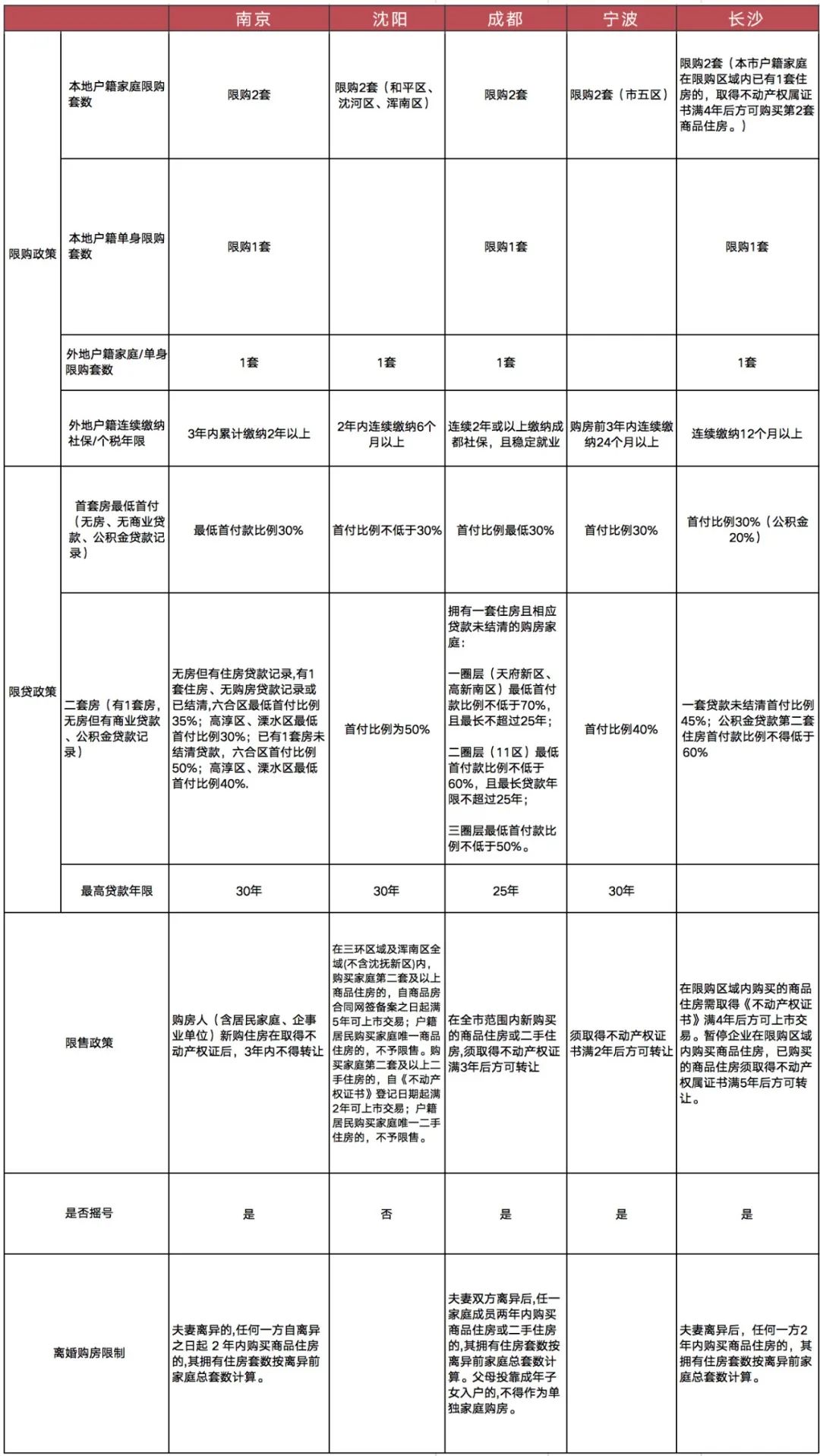 限購政策最嚴格的仍然為四大一線城市,在限購套數相似的前提下,排除房價因素,外地人買房的門檻相對較高,北上廣深均設置外地戶籍連續繳納社保或個稅年限均為5年以上。杭州、南京、成都和寧波則要求3年內連續繳納2年以上,且成都明確要求“穩定就業”的限制。