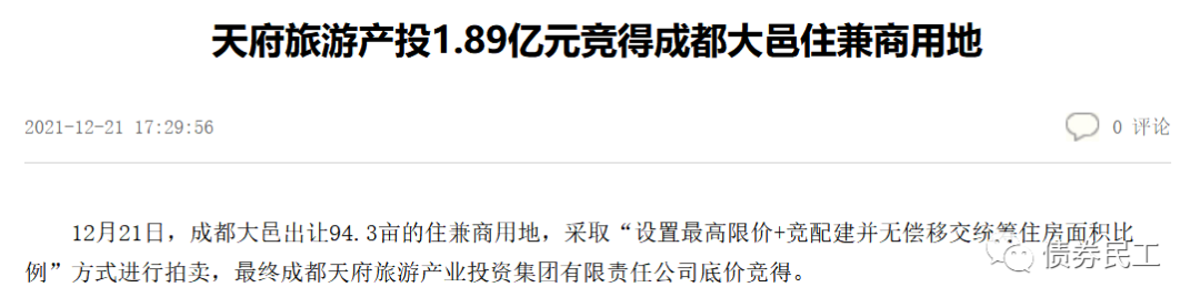 2021年12月21日,成都文化旅游發(fā)展集團(tuán)有限責(zé)任公司的子公司成都天府旅游產(chǎn)業(yè)投資集團(tuán)有限責(zé)任公司以1.89億元的價(jià)格摘得成都大邑縣總出讓面積為94.3畝的土地,土地性質(zhì)為住兼商用地。