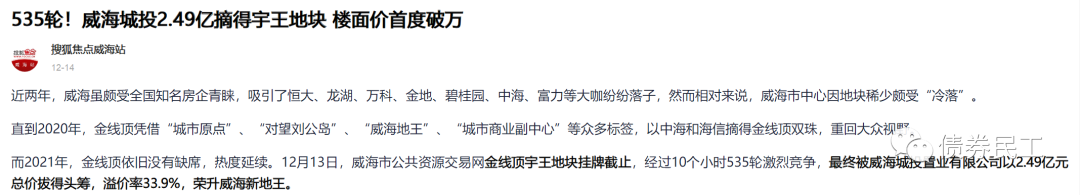 2021年12月13日,威海城市投資集團(tuán)有限公司子公司威海城投置業(yè)有限公司以2.49億元的價(jià)格摘得金線頂宇王地塊總出讓面積為18686平米的土地,土地性質(zhì)為住宅用地。