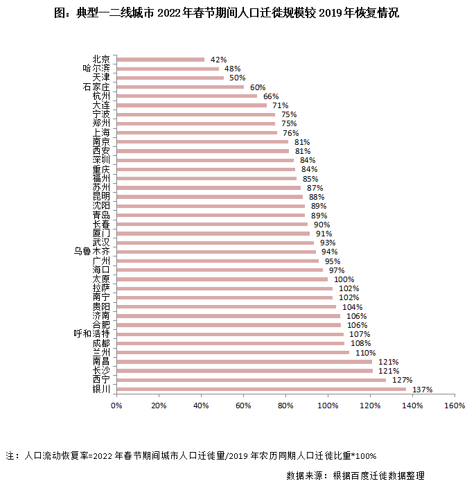 如果我們把2019年春節人口遷徙當作基年,將2022年春節期間各城市人口遷徙量與2019年農歷同期相比,就可以粗略的估計出各城市人口遷徙恢復情況。通過測算,37個一二線城市2022年人口流動恢復率約為86%。細分來看,可以把這些城市分為三類: