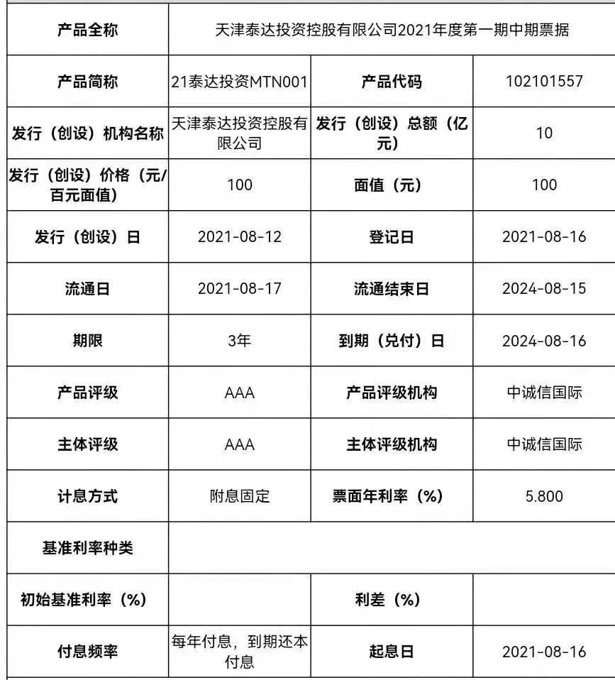 2021年8月16日,天津泰達(dá)投資控股有限公司(以下簡稱“泰達(dá)控股”)發(fā)行的“21泰達(dá)控股MTN001”正式起息。泰達(dá)控股本期中期票據(jù)的發(fā)行規(guī)模10億元,債券期限3年,票面利率為5.80%。這是6月份天津召開債券市場投資人懇談會之后,泰達(dá)控股首次成功發(fā)行長期限信用債券!!!更關(guān)鍵的是,本期中期票據(jù)的發(fā)行利率大幅下降,標(biāo)志著投資者對于泰達(dá)控股的充分認(rèn)可,意味著泰達(dá)控股在信用債券市場上王者歸來!
