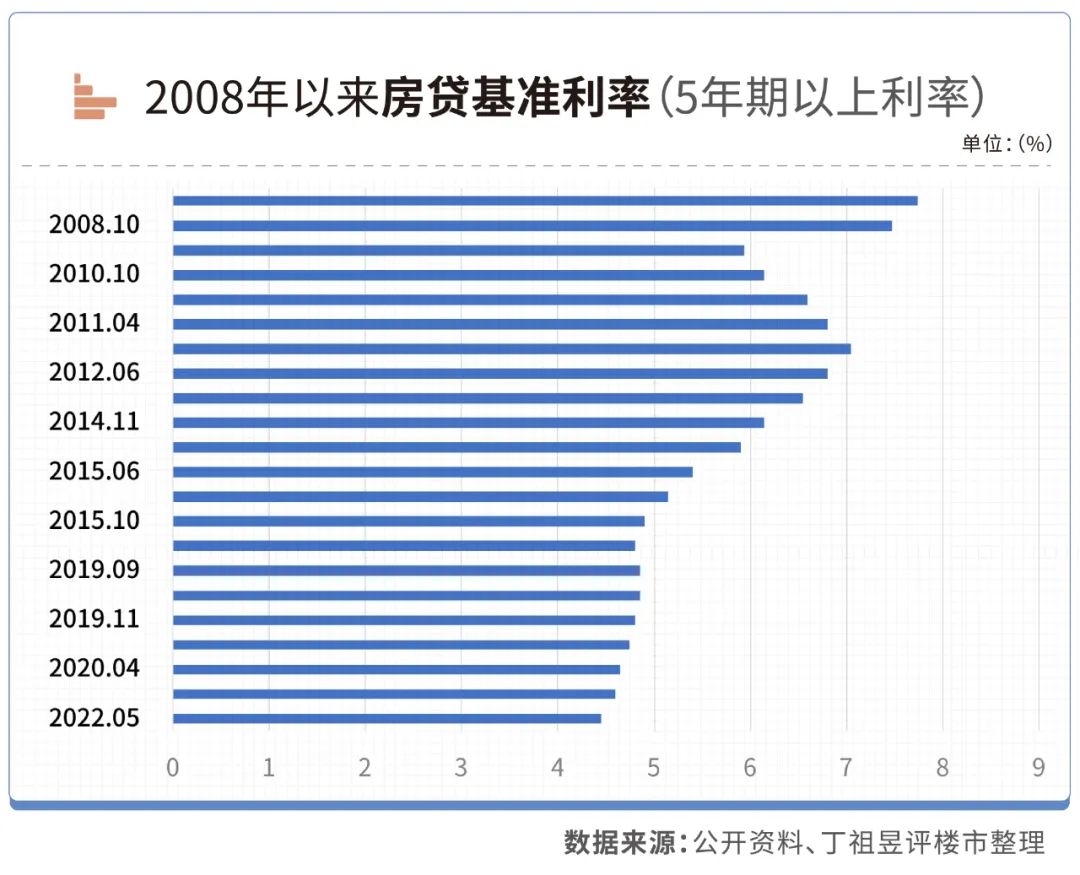 為了刺激購房需求,據(jù)CRIC梳理,僅2008年全年就有5次降息,累計(jì)降幅2.16%,當(dāng)年12月5年期以上貸款利率下降至5.94%。