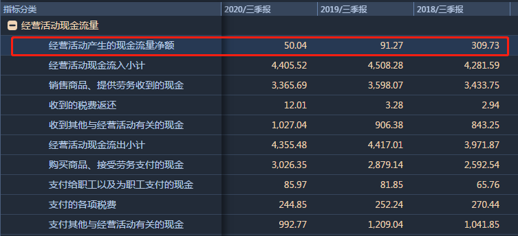 業績下滑進一步影響了綠地的經營現金流,如下圖所示,2020年第三季度綠地控股的經營活動現金流凈額為50.04億元,較去年同期下滑45.17%。