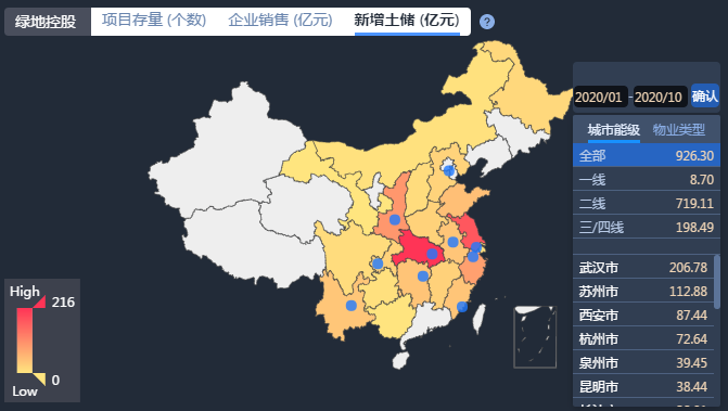 今年以來,綠地的拿地均價為3053元,較去年同期上漲24.87%。從項目分布來看,新增土儲集中在二線城市(二線城市新增拿地金額為719.11億元),新增土儲排名前三的城市分別為武漢市(206.78億元)、蘇州市(112.88億元)、西安市(87.44億元)。