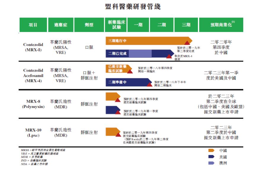 盟科醫(yī)藥是以研發(fā)多重耐藥即超級細菌感染的抗菌藥為主。公司的在研項目只有4個,其中主要產品有治療革蘭氏陽性多重耐藥菌感染的contezolid(MRX-I)以及contezolid acefosail(MRX-4)。公司研發(fā)最快的項目MRX-I預計最快2020年年底在國內上市。