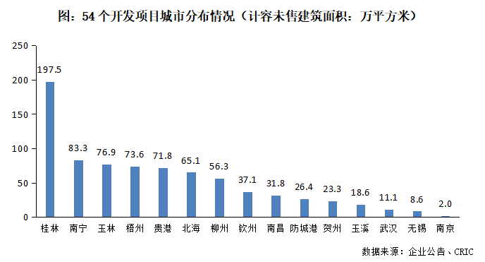 從公告披露信息可知,此次收購涉及目標項目共57個,包含54個開發項目及3個代建項目,總計容未售建筑面積為825.17萬平方米。其中,54個開發項目計容共計未售建筑面積783.33萬平方米,90.8%位于廣西各城市核心區域,主要分布在桂林、南寧、玉林等城市,且以住宅為主,流動性強。這些優質資產的注入,大大增強了融創在廣西的競爭力和可持續發展能力。