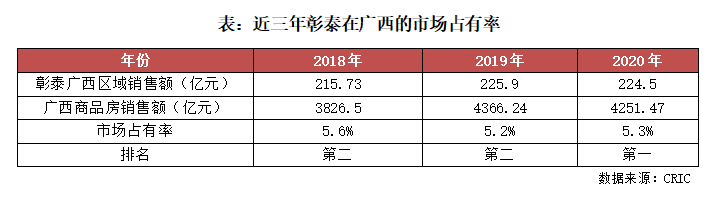 彰泰作為廣西規模最大的本土房企,2018-2020年連續三年銷售額均超過200億元,其中2020年在廣西區域的全口徑銷售額達到224.5億元、權益銷售金額達到161.4億元,均位列第一。根據廣西2020年商品房銷售額4251.5億元計算,市場占有率約為5%,超過碧桂園位居首位。今年一季度,彰泰繼續以47.44億元領跑,增長預期向好。