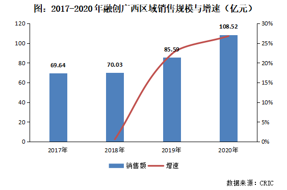 近年來,隨著廣西房地產市場打開,各大品牌房企競相入駐,截至目前TOP20中僅有個別房企未有項目布局。從克而瑞排行榜來看,2020年碧桂園、龍光、陽光城、萬科、恒大、融創、金科等外來品牌房企占據廣西市場第一陣營,競爭激烈。融創自2016年首進廣西,也有意加速市場擴張,規模增速不斷提升,2020年廣西區域銷售額突破百億,達到108.5億元,位列房企第8位。