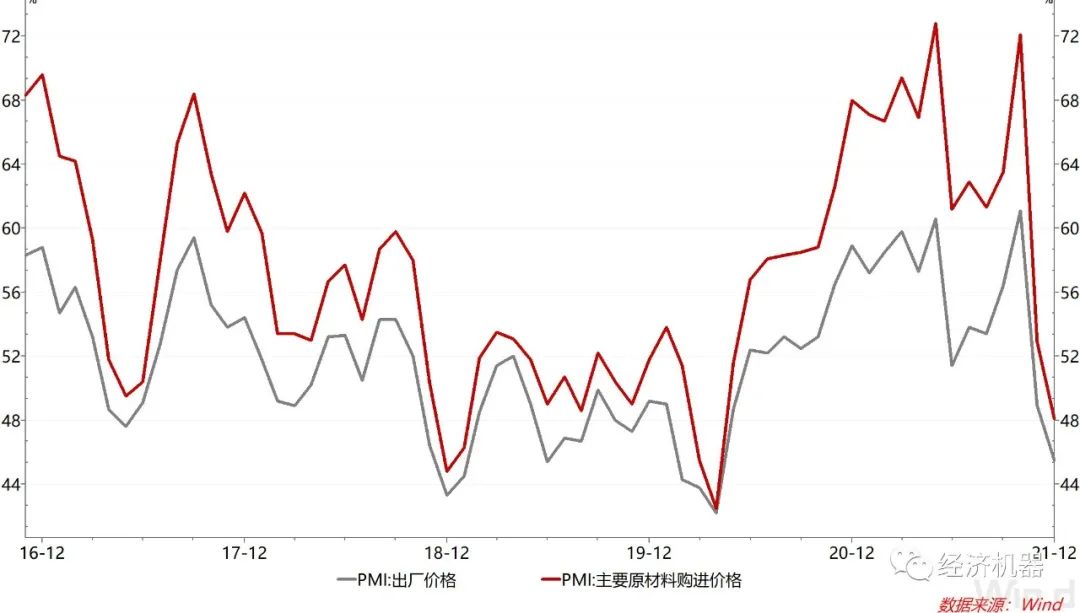 3)工業生產領域價格繼續回落,降幅收窄,原材料價格走勢開始分化。12月,PMI主要原材料購進價格指數和出廠價格指數分別為48.1%和45.5%,較上月繼續回落,分別下行4.8和3.4個百分點,降幅有所收窄(圖3)。