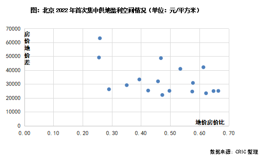 反之北京城建競得的豐臺區(qū)[2022]003號地塊,成交樓板價為22008元/平方米,銷售指導(dǎo)價達(dá)到88000元/平方米,地價房價比僅有0.26,房價與地價的差值更是在6萬元/平方米以上。但地塊存在5.4萬平方米的產(chǎn)業(yè)用地,且有9800平方米的保障房,運(yùn)營的復(fù)雜系數(shù)較高,因此最終仍是底價成交。