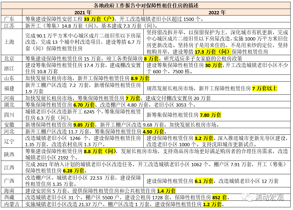 (三)多地在政府工作報告中提出了2022年保障性租賃住房建設(shè)的具體任務(wù),如廣東33萬套、浙江30萬套、上海17.30萬套、江蘇14.80萬套、安徽9.85萬套、山東8.90萬套、陜西8.80萬套、北京8萬套、四川7.80萬套、福建與河南均為7萬套、湖北6.70萬套、廣西6.10萬套等。