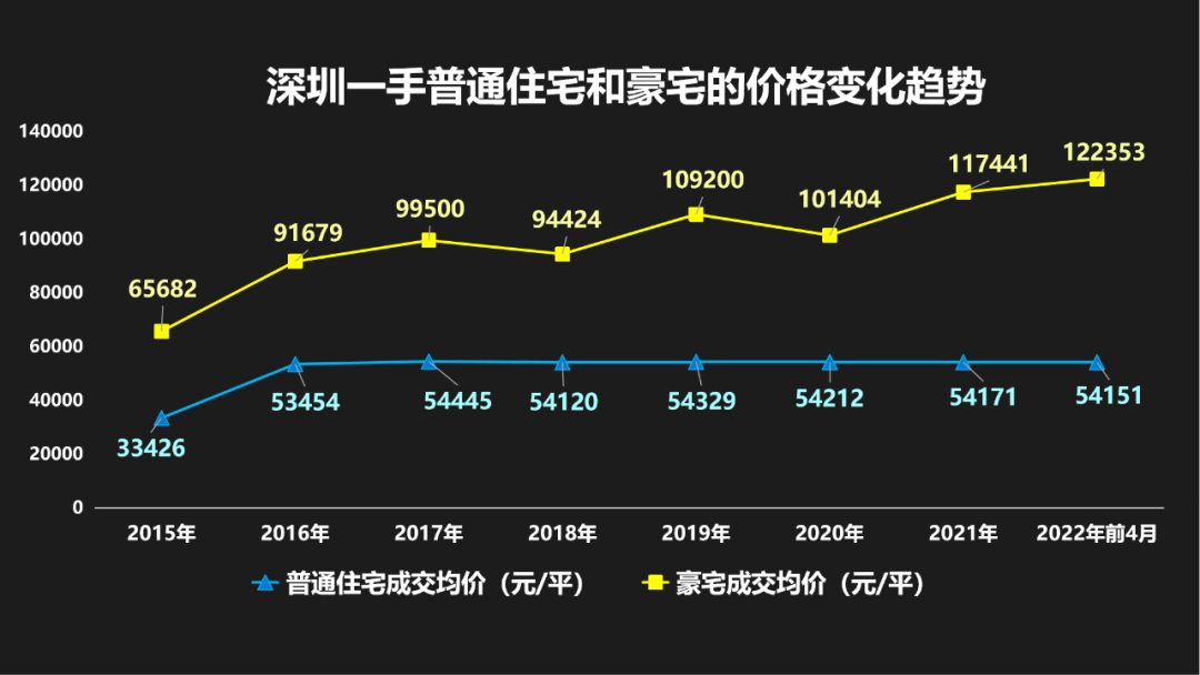 看深圳市場,豪宅的成交價在不斷攀升,今年前四個月的平均房價已經(jīng)到了12萬多一平,近八年的時間漲了1.86倍。