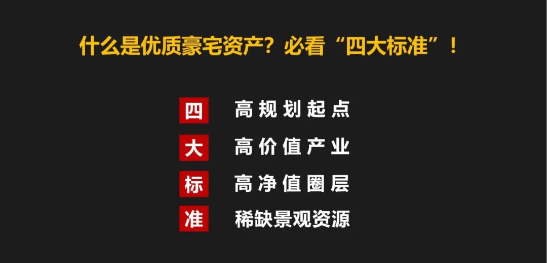 王老師提出,優(yōu)質(zhì)豪宅資產(chǎn)一定要看準(zhǔn)四大稀缺標(biāo)準(zhǔn):高規(guī)劃起點、高價值產(chǎn)業(yè)、高凈值圈層、稀缺景觀資源。