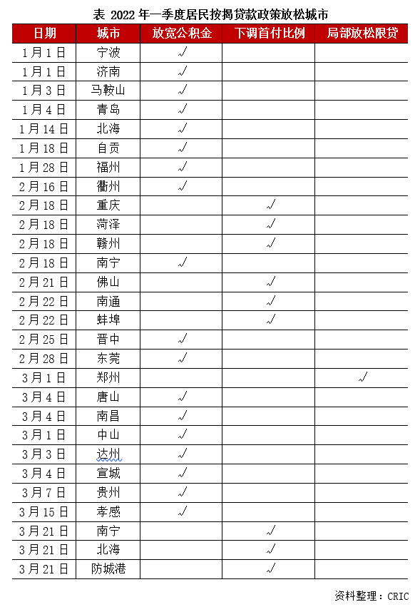 2022年一季度,中央多部委密集表態(tài)穩(wěn)地產(chǎn),財政部明確今年內(nèi)不具備擴大房地產(chǎn)稅改革試點城市的條件,兩會定調(diào)探索行業(yè)新發(fā)展模式,支持新市民等三類購房需求。房企融資、預(yù)售資金監(jiān)管適度松綁,并購貸不計入“三道紅線”、保障性租賃住房貸款不計入“兩道紅線”、全國性商品房預(yù)售資金監(jiān)督管理辦法出臺。居民按揭貸款政策邊際改善,各地放寬公積金貸款、下調(diào)首付比例、局部放松限貸、下調(diào)房貸利率。15城出臺新政刺激購房需求,重點涉及松綁限購、取消限售、發(fā)布購房補貼、棚改貨幣化安置等。
