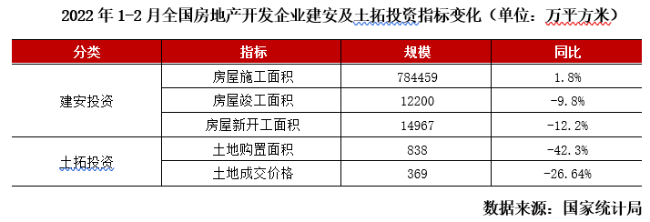 2022年一季度行業(yè)繼續(xù)調(diào)整,前2月銷售和投資同比增速均為近6年次低,全國商品房銷售面積、金額分別同比下降10%和19%,銷售均價同比下降11%。土地購置面積和房屋新開工、竣工面積分別同比下降42%、12%和10%,僅房屋施工面積微增2%,受此影響下開發(fā)投資額僅同比微增4%。