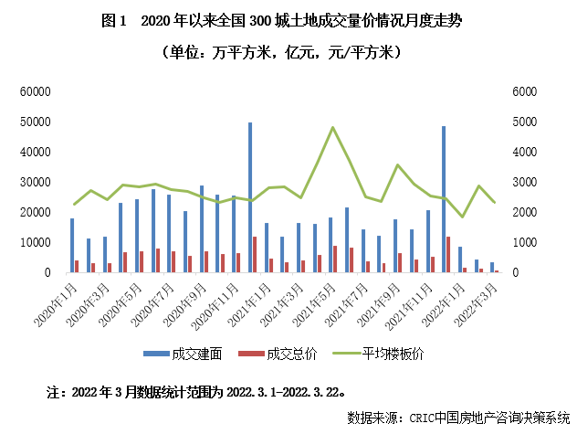 成交規(guī)模跌入谷底,同比降幅高達(dá)六成。一季度,全國300城經(jīng)營性土地成交建筑面積僅15771萬平方米,環(huán)比跌幅高達(dá)81%,同比來看,受集中供地階段性“低谷”和市場下行的影響,同比降幅高達(dá)60%。分月來看,在供地節(jié)奏變化及多地疫情反彈的影響下,1-3月的土地成交量均明顯不及去年同期,一季度土地成交規(guī)模也因此跌入谷底。